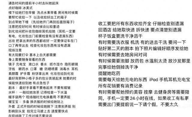 (真实的助理工作十分琐碎) 小东分享了他陪同艺人参与商务拍摄时的典型一天:商务拍摄多在下午启动,但他早上8点就得起床,仔细核对拍摄档案,并确认艺人的身体与工作状态;10点需与拍摄团队逐一沟通细节,包括服装造型数量、拍摄间隙安排、时间节点把控、艺人当日行程衔接、饮食需求及现场环境布置等;12点只能匆匆简单用餐。 “艺人一般夜生活比较丰富,原本约定好1点半到拍摄现场,却常常要拖到2点才出发。这种情况下,助理就必须绞尽脑汁向拍摄团队编造理由解释迟到原因。”小东无奈地说。 抵达拍摄地后,助理需先行下车,逐一检查休息室的环境、所需用品是否齐全以及现场安全情况,同时还要阻止工作人员拍摄艺人未化妆、穿私服的状态,确认无误后才会请艺人下车。 拍摄正式开始前,在艺人化妆、吃饭、休息的间隙,助理要提前携带多套服装造型供艺人挑选,同步拿出PDF文件向艺人说明拍摄时的姿势与表情要求,还需与拍摄团队沟通灯光调试、机位摆放等细节。等正式开拍后,助理要负责为艺人拍摄工作花絮,并不时提醒艺人补妆。 “哪怕艺人的妆容其实没什么问题,也得适时上前说‘不好意思,老师,补下妆、弄下头发’——其实根本没必要,但艺人就喜欢这样。尤其是拍摄多人商务合作时,只要其他艺人有补妆的动作,自家艺人也一定要做,这也算是行业里默认的习惯了。”小东苦笑着补充道。 他进一步解释:“每拍完一套造型,都要及时把拍摄素材展示给艺人看,还要时刻观察他的表情:如果艺人面无表情,就说明他对拍摄效果不满;要是把手插在兜里,就表示基本认可。整个过程中,还得不断给艺人打气鼓励,面对男艺人就说‘哥好帅,这个动作好好看’,面对女艺人则夸‘姐好漂亮’。虽然大家都知道艺人可能早就听烦了这些话,但这么说能让他们心情愉悦,后续工作进展也会更顺利。” 除了商务工作,艺人进组拍戏时的助理配置也有不同模式:部分正规公司会派遣固定的正式艺人助理跟组;而一些经纪公司则会选择临时招聘跟组助理,这也催生了一批专门为艺人输送助理人才的中介公司。