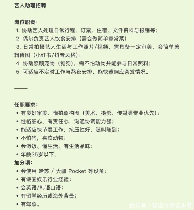 (艺人助理招聘要求) 她提到,这类助理多是艺人亲戚,“从艺人出道就跟在身边,艺人对他们好的时候也不吝啬,‘帮买房买车,带出国旅行’,而一旦犯错,也会面临艺人更为严厉的责骂”。 非亲属助理则常受艺人亲属压迫,小东透露,给某男星当助理时,艺人妈妈曾直接推他:“你杵这儿干嘛?去啊!”让他帮提礼服裤子;还有一次因没拦住十几个粉丝,被艺人妈妈在酒店里骂了整整半个小时。且“他的其他亲戚对工作人员也非常颐指气使,日常说话都是命令式,稍有不满就甩脸子”,而“艺人对这些事都一清二楚,但一般都是坐在旁边玩手机,始终头也没抬一下”。 宗宗还曾在盛典结束的冬夜,被穿得单薄的女艺人要求脱大衣,自己仅穿半袖在寒风中瑟瑟发抖。 再者是微薄且不稳定的薪资待遇。 小东透露,2014年入行时“工资只有4000多元,艺人心情好的时候,把他代言的微商产品当奖品送给我们,心情不好的时候,年底就给发了200元的红包”,不过他也承认“圈内也有很多大方的艺人,年底给工作人员几千几万的红包,还给工作人员买最新款手机等”。 像白鹿与呵呵这般的搭档,便是无数人艳羡的存在。两人2015年相识,呵呵陪着白鹿熬过事业低谷,白鹿走红后也真心相待,不仅为呵呵开通亲密付、送房产、赠汽车,还帮她追星、出差为她升舱、与她共享衣橱。 如今十年过去,招聘网站上艺人助理薪资6000-15000元不等,大多在七八千价位。 小白透露,跟组艺人助理薪资按天算, “普通情况一天200-300元,没有经验还需他人指导的助理,日薪仅100元”,且“基本上都是临时雇佣,所以没有五险一金”。